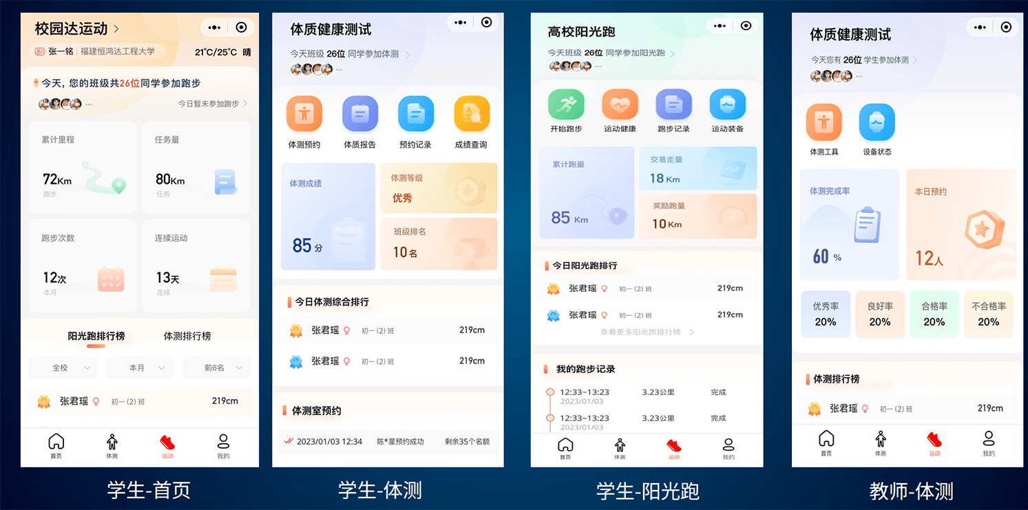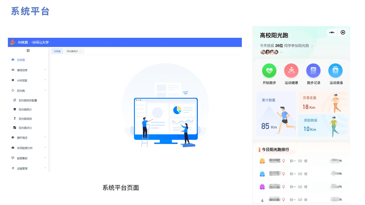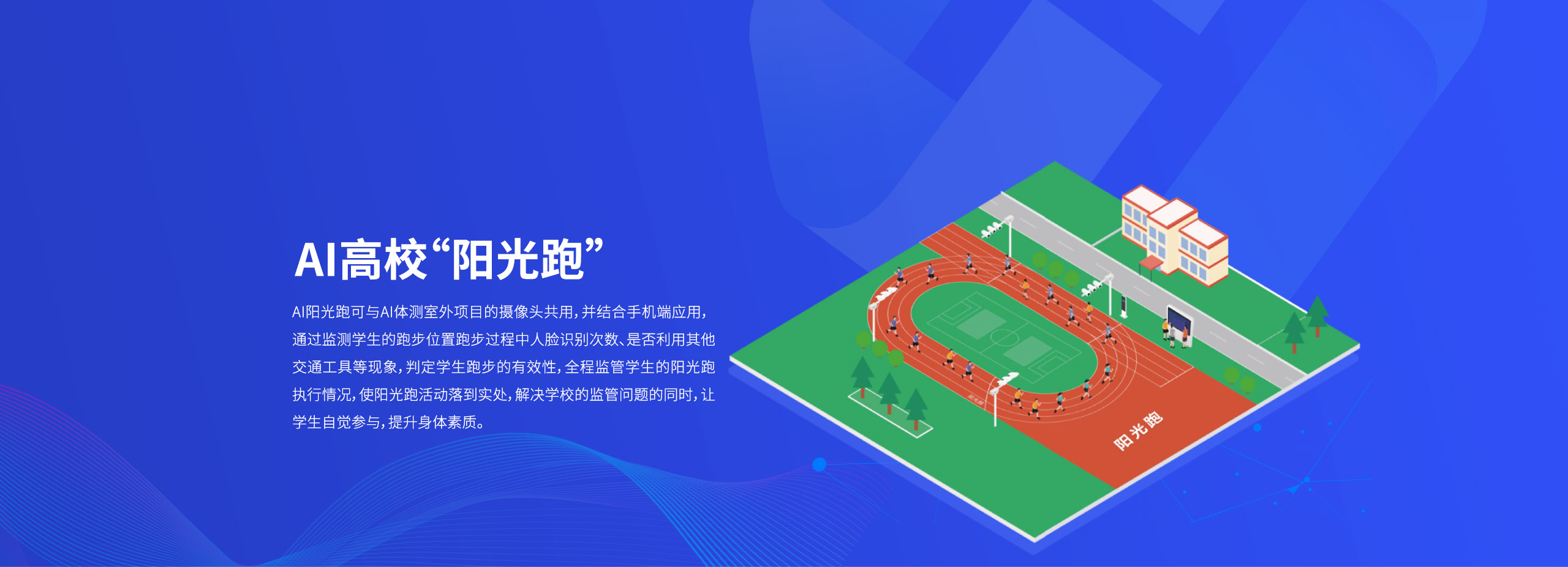 AI阳光跑可与AI体测室外项目的摄像头共用,并结合手机端应用,通过监测学生的跑步位置跑步过程中人脸识别次数、是否利用其他交通工具等现象,判定学生跑步的有效性全程监管学生的阳光跑执行情况,使阳光跑活动落到实处,解决学校的监管问题的同时,让学生自觉参与,提升身体素质。